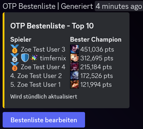 Achtung: Wenn eine Bestenliste nicht mehr in den letzten 20 Nachrichten eines Textkanals enthalten ist, wird es nicht mehr aktualisiert. Deshalb empfehlen wir, Bestenlisten in einen separaten Textkanal zu stellen.